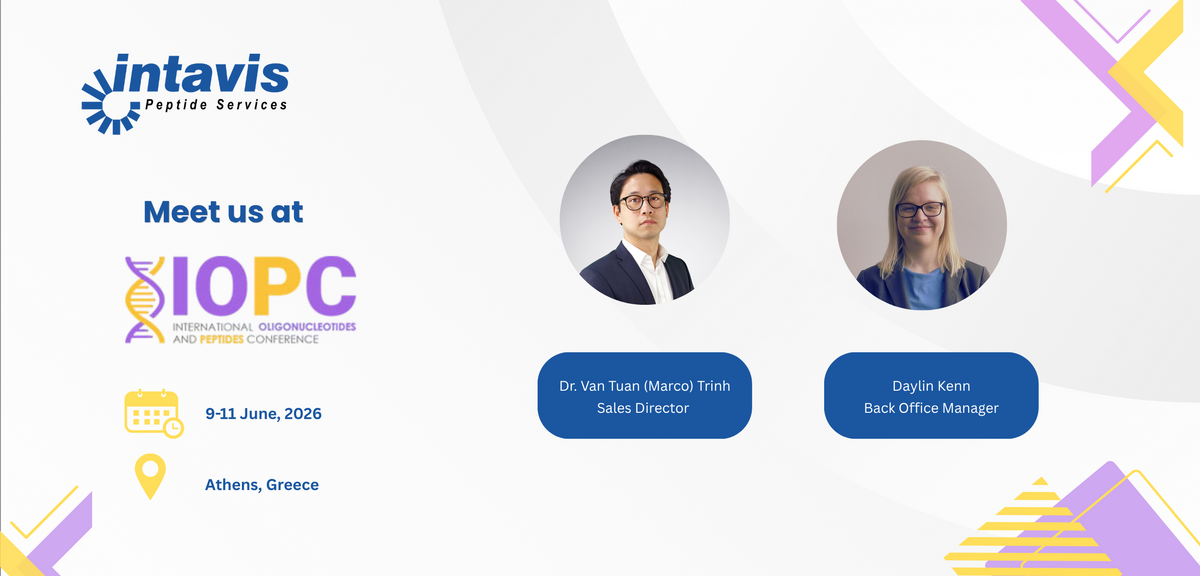 Intavis Peptide Services wird auf der Konferenz durch Dr. Van Tuan (Marco) Trinh (Sales Director) und Daylin Kenn (Back Office Manager) vertreten sein. Beide stehen für Gespräche über Lösungen in der Peptidsynthese sowie über Kooperationsmöglichkeiten mit Partnern aus Forschung und Industrie zur Verfügung.