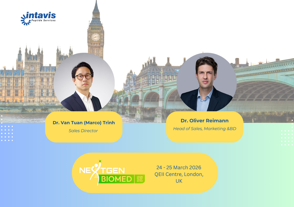 Im Rahmen der Branchenpräsenz auf der NextGen Biomed wird Intavis Peptide Services durch Dr. Oliver Reimann (Head of Sales, BD & Marketing) und Dr. Van Tuan (Marco) Trinh (Director of Sales) vertreten. Sie geben Einblicke in Peptid-Innovation und exzellente Herstellung – von komplexer Peptidsynthese und kundenspezifischen Modifikationen bis hin zu skalierbaren Prozessen für Discovery- und präklinische Programme.