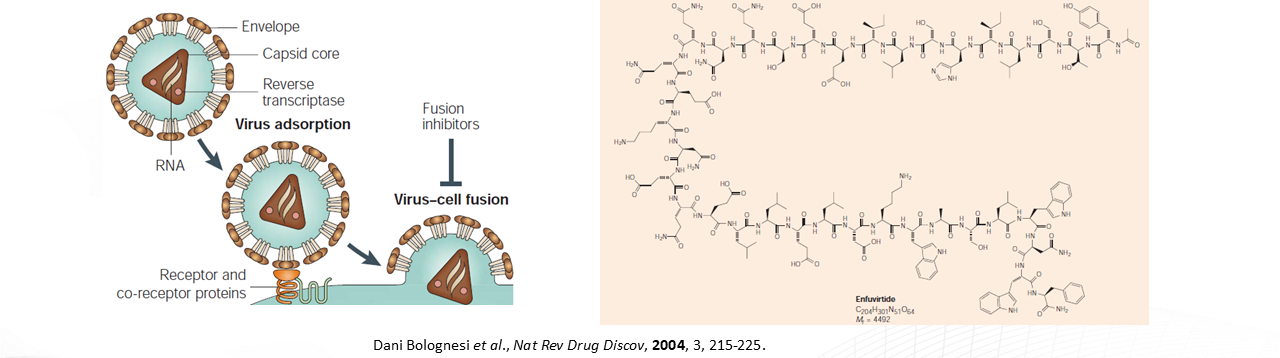 A historical milestone in peptide therapeutics was Enfuvirtide (Fuzeon), the first peptide drug to block HIV-1 entry into host cells.